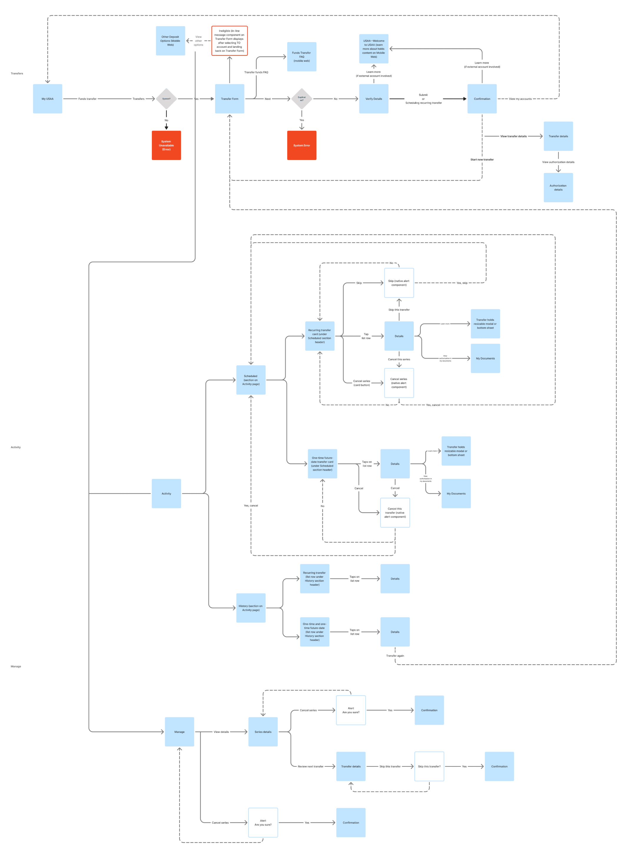 This user flow illustrates the full lifecycle of transfer funds, from setup to failure handling, with decision logic surfaced at every branch.
